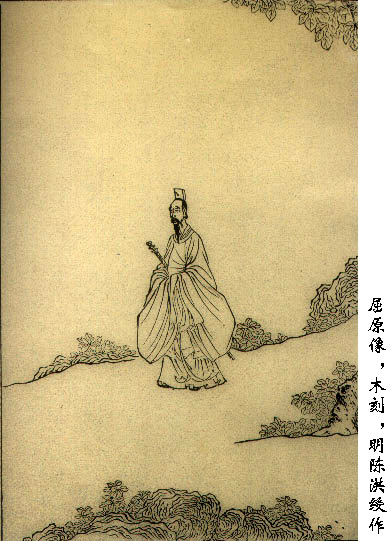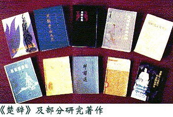 楚国的诗歌源远流长,至战国中后期,大诗人屈原(图1,明代陈洪绶木刻《屈原》)在楚国诗歌的基础上,与哲学思想一样,融南北夷夏之交,创造出一种新的骚体诗歌----楚辞。“楚辞”一名,秦汉间已出现,至刘向收屈原及其后学宋玉等人的作品,编辑成集,从此,《楚辞》就成为楚国诗歌总集的名称(图2,《楚辞》及研究著作)。由于《楚辞》具有浓厚的地方色彩,故宋人黄伯思说:“盖屈、宋诸骚,皆书楚语、作楚声、纪楚地、名楚物,故可谓之楚辞。”