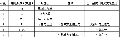注:①周的分封制度实际上不存在所谓“公、侯、伯、子、男”五等爵位。 ②采邑规模根据各属封国的不同,规模不等。如侯伯之城方五里(即方三百雉),那么侯伯封国内的采邑城大都当为方一百雉,中、小都类推。