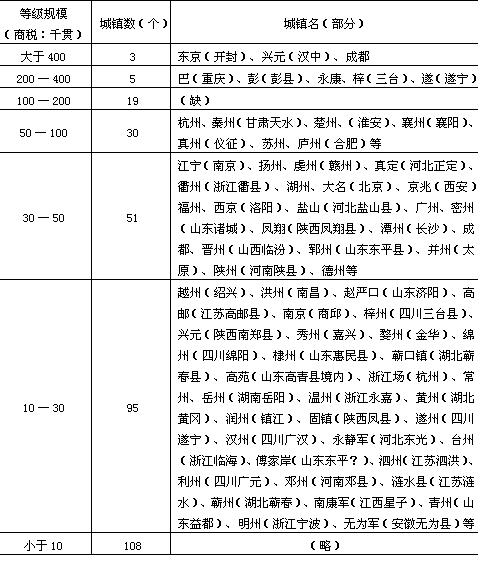 宋、元时期,由于城市经济职能的加强,以及社会经济的发展,城镇体系的等级规模结构与隋、唐时期相比,又发生了重大的变化。其中最主要的是行政建制变更,原有以行政中心为主的城市等级系列得到了进一步完善;其次,城市等级与人口规模对应关系形成,地区性经济中心城市(中等城市)开始普遍出现,县城网络基本形成,大、中、小相结合的城市规模分布体系形成。 1.行政建制变更,以行政中心为主的城市等级系列进一步调整 宋代行政建制改变了隋唐传统①,设路于府、州之上,相当于唐代道制②,府多设于较大而重要的州,但府、州基本同级,县仍为基层行政单位。此外,由于这一时期商业、手工业的发展,还在坑冶、牧马、铸钱、产盐等处所设置监制,在军事要冲设置军制③。这样,全国自上而下形成了首都——路城——府、州城(监、军城)——县城——镇——市六级城镇系统。 至元代,除京师附近地区直隶于中书省外,又于河南、浙江、湖广、陕西、辽阳、甘肃、岭北、四川、云南等处设11行省;路降为二级地方行政单位,隶属于省;府或隶属于省,或隶属于路;州属于路或府;县仍为基层行政单位。这样元代我国城镇体系又进一步演化为首都——省会——路城——府城——州城——县城——镇——市八级等级系统,特别是省会城市得到了很大发展。 总观宋、元两代行政建置与唐代相比,城镇体系的等级系列更趋于完善,即由原来的四级系统逐步演化为六级乃至八级系统,基本上形成了我国近现代城镇体系等级系列的基本格局。 2.城镇等级规模关系基本形成 在宋代随着地域经济的进一步发展,城镇体系等级系列逐步完善,已具有明显的等级规模关系。表现在: (1)首位城市——国都。国都是全国城镇体系的核心和大型的政治、经济、文化中心城市。其人口一般超过100万人。如北宋东京开封,据《宋史·地理志》记载,“开封府,崇宁间(公元1102~1106年)有户二十六万一千一百一十七,四十四万二千九百四十口(男丁数)”,全城总人口当在100万以上。南宋临安(杭州),据《武林旧事》记载,有户30万,全城总人口当亦在100万以上。 (2)次级城市——府、州城。这类城市数量较多,规模不等。一般而言,府城大于州城。但由于地区经济发展水平不同,在经济发达地区,一些州城规模往往大于经济落后地区的府城。从总体来看,这类城市居民一般能达到数万以至十余万户,人口规模相当于现代的中等城市(20万~50万人口不等)。 (3)三级城市——县城。自秦、汉以来,县制一直是我国相对稳定的基层行政单位。但由于我国地域辽阔,直到宋、元时期,全国国土一直处于开拓、发展的过程中,因而县的置废频繁,相应地影响其人口规模。总的来说,县治设置愈久,人口规模愈大;反之亦然。至宋代我国县城居民一般在1000~5000户左右,人口规模达到了5000~20000左右。 (4)四级城镇——市镇。如前所述,市镇的发展主要开始于宋代,但由于促发因素不同,又表现为人口增长速度的差异。从其人口规模看,可分为三个亚级:大镇,其居民在数千户以上,人口规模与当时一般县城相差无几;中镇,其居民在1000~2000户之间,人口规模在5000~10000人左右,也可与经济发展比较落后地区的县城相伯仲;小镇,其居民总的说来在1000户以下,甚至还有百户以下的小镇,如楚州吴城镇,南宋初年才有88户人家。 宋代都城及部分府州县镇人口规模详见表5-2。 3.地区性经济中心城市(中等城市)网络出现 在宋代由于城市经济职能加强,也相应地形成了一批比一般城市经济实力雄厚的地区性经济中心城市(中等城市)。这些地区性经济中心城市,不仅是该地区范围内的农业生产中心、手工业生产中心和交通要地,而且也是商品交换、物资集散或对外贸易中心。现从商税征收及其它文献记载试分析如下:(1)城市商税征收。根据《文献通考》记载,宋神宗熙宁十年(公元1077年),全国各主要城市商税额如表5-3,其时商税额最 表5-2宋代都城及部分府州县镇人口规模表