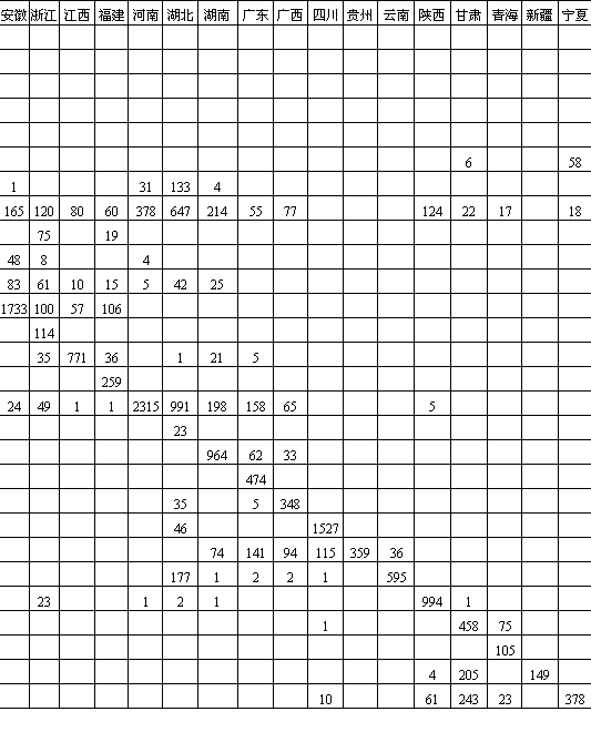 地,尤其山西省与全国各省区的联系较密切和广泛,但从大宗煤炭流量流向看,仍不失为一个相对独立的区域。若从铁路客流图看则更为明显,现状已形成以北京、天津为核心,京沈(至秦皇岛段)、津沪(至德州)、京广(至邯郸段)、京包、石德、石太、同蒲等铁路为支络的华北地区城市子网络。 (3)华东地区城市子网络。这一地区位居我国长江、黄河下游和淮河流域,是我国社会、经济水平发展最高的地区之一。从省区煤炭流量流向统计表看,已形成一个相对稳定的区域。铁路客流图也显示这一地区已形成以上海为中心,津沪(德州以南)、沪杭铁路为枢轴,胶济、东陇海、浙赣、鹰厦铁路和沿海水运干线为支络的华东地区城市子网络。 (4)中南地区城市子网络。这一地区的河南是主要的能源输出省,煤炭以供应湖北省为主;湖南及两广基本自给。因此,就货流看,这一地区的联系是比较松散的。但从铁路客流图看,现已形成两大客流放射网,即以郑州为中心的“十”字形客流网;和以株洲为中心的“大”字形客流网,相应构成了以郑州、武汉、长(沙)、株(洲)、(湘)潭和广州为节点,京广铁路为枢轴,陇海、湘黔、湘桂、汉丹等铁路干线为支络的中南地区域市子网络。 (5)西北地区城市子网络。以省区煤炭流量流向统计表和铁路客、货流看,我国西北地区也基本形成了一个相对完整的区域,尤其新疆、宁夏与甘肃的联系更为密切。目前已初步形成以西安、兰州、乌鲁木齐为核心,陇海铁路(西段)、兰新铁路为枢纽,包兰、兰青线为支络的西北地区城市子网络。 (6)西南地区城市子网络。建国以来,我国的西南地区是“三线”建设的主要地区,已建成一批新兴工矿城市和区域交通骨干网。从铁路客、货流图可以看出,本区现已形成以重庆、成都、昆明、贵阳为四大节点,宝成、成昆、成渝、川黔、贵昆等铁路干线为脉络的西南地区城市子网络雏形系统。