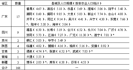 注:“*”号者为1987年底已设城市。 说明:(1)表中各县城总人口均超过5万; (2)辽宁省金县1987年划为大连市金州区。 资料来源:中华人民共和国公安部三局编,《中国城镇人口资料手册》,地图出版社,1985年。